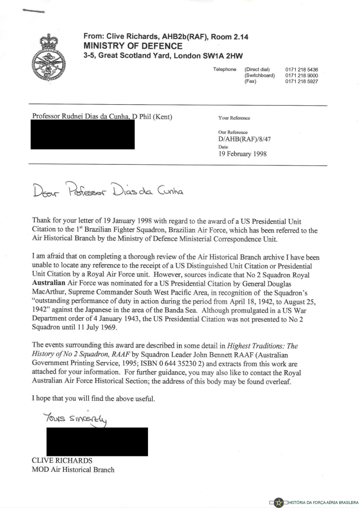 A “Presidential Unit Citation” desperta um interesse especial em nós brasileiros, pois o 1º Grupo de Aviação de Caça da Força Aérea Brasileira (FAB) é um dos três esquadrões não pertencentes às U.S. Army Air Forces que receberam tal honraria. Tradicionalmente, acreditava-se que apenas o esquadrão brasileiro e uma unidade da Royal Air Force britânica a haviam recebido (ver referência [4, pág. 442]); no entanto, pesquisas recentes por nós realizadas junto às agências históricas da USAF e RAF (U.S. Air Force Historical Research Agency e Air Historical Branch, MoD, respectivamente) indicam que nenhum esquadrão da RAF a recebeu. Os outros dois esquadrões distinguidos pela citação são os Esquadrões nº 2 e nº 13 da Royal Australian Air Force (RAAF) (referências [1] e [5]). A seguir apresentaremos um pouco da história de cada unidade.