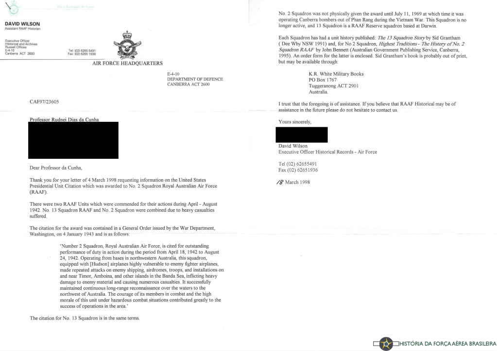 “Tomo a iniciativa de congratular o Esquadão nº 13 pela excelente maneira com a qual suas missões foram realizadas na região de Timor no período compreendido entre 10 de agosto a 18 de setembro de 1942. A iniciativa e coragem demonstradas durante as inúmeras missões de reconhecimento, bem como os raides sobre navios e instalações inimigos foram muito gratificantes. Refiro-me particularmente aos ataques realizados por nove Hudsons a tropas, prédios e transportes motorizados em Mape, Timor, no dia 14 de agosto de 1942. Todas as bombas foram largadas sobre a área do alvo, várias delas atingindo diretamente os alvos. As bem-sucedidas missões de reconhecimento realizadas sobre Beco, Viqiveque, Neva Anadia e Cabo Beco mostraram-se da maior importância. Essas operações contribuíram enormemente para o sucesso das Forças Aliadas durante o período e o seu Esquadrão deve com justiça sentir-se orgulhoso por sua participação.” [5]